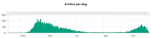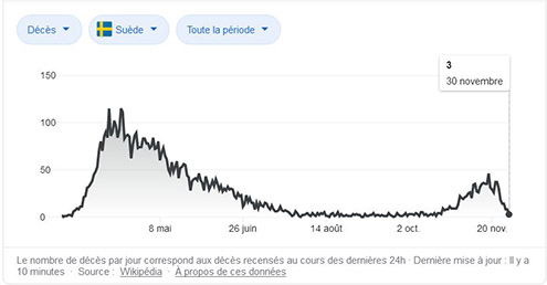 Pour obtenir le schéma ci-dessus, il suffit de mettre "suede coronavirus morts" dans Google. Cette image n’est qu’une copie d’écran de ce qu’on obtient alors. Mais, dans Google, on peut balader le curseur de la souris sur le schéma, et on voit alors au jour le jour le nombre de morts. Pour la copie d’écran, j’ai mis le dernier jour pour lequel il y avait des données. Il y a eu seulement 3 morts le 30 novembre 2020.