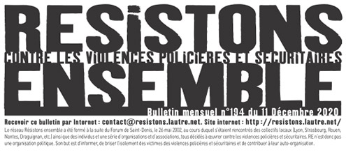 Voici en pdf, le No 194, du 11 décembre 2020, du petit journal mobile recto-verso A4 "RESISTONS ENSEMBLE" du réseau contre les violences policières et sécuritaires.