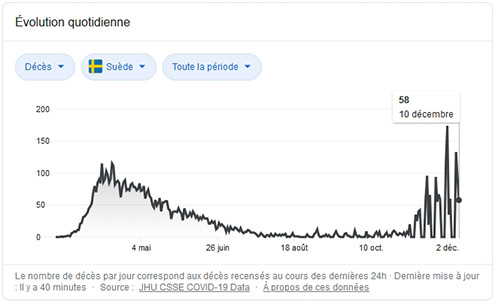 Ci-dessus, la courbe des morts pour la Suède le 10 décembre 2020 donnée par Google, et ci-dessous celle donnée par l’agence suédoise de la santé publique :