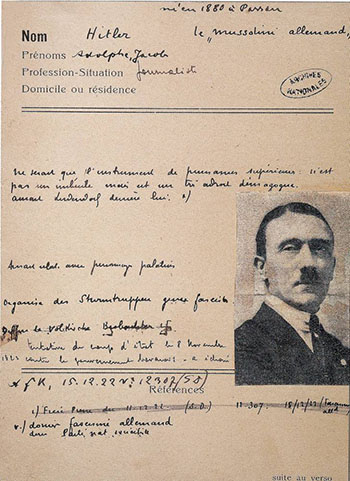 note 1 : La première fiche en français sur Hitler date pourtant de 1924, mais elle n’émane ni du Deuxième Bureau ni de la Sûreté générale : c’est le petit service de sûreté de la Haute Commission interalliée des territoires rhénans qui l’a produite. Le second prénom de Hitler est Jacob.