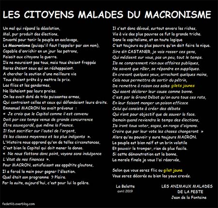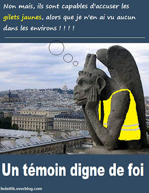 Macron aurait trouvé paraît-il indécent de parler de ce qu’il allait faire pour les Gilets jaunes pendant que brûlait Notre-Dame de Paris. Moi, je dis que ce qui est indécent, c’est de nous laisser dans l’indigence plus longtemps : Notre-Dame de Paris compte tout de même bien moins qu’une seule personne qui crève de faim !
