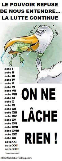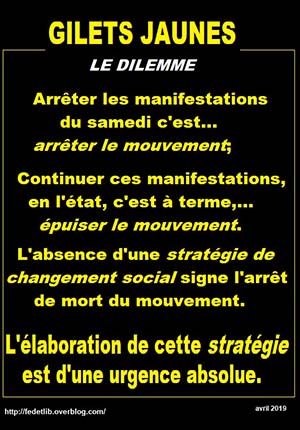 Depuis lors, le mouvement GJ n’a cessé de chercher sa voie, sans réellement sortir de ce cercle vicieux, d’ « Acte en Acte », tournant en rond dans les centres-villes, s’épuise, et voit surtout son soutien populaire s’éroder, inexorablement, malgré qu’aucune des questions sociales posées à partir du 17 Novembre n’ait été concrètement et durablement résolue.