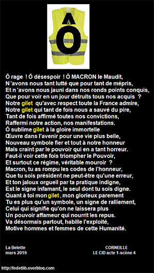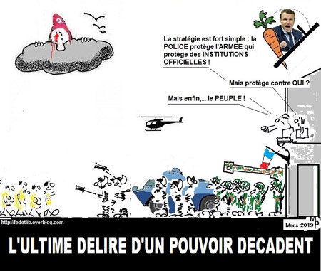 « Il faut terroriser les terroristes ! » à propos des Gilets Jaunes considérés comme tels puisque Macron leur envoie désormais l’armée avec l’opération Sentinelle destinées aux terroristes.