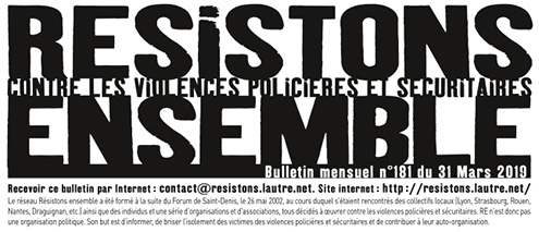 Voici en PDF, le n° 181, du 31 mars 2019, du petit journal mobile recto-verso A4 "RESISTONS ENSEMBLE" du réseau contre les violences policières et sécuritaires.