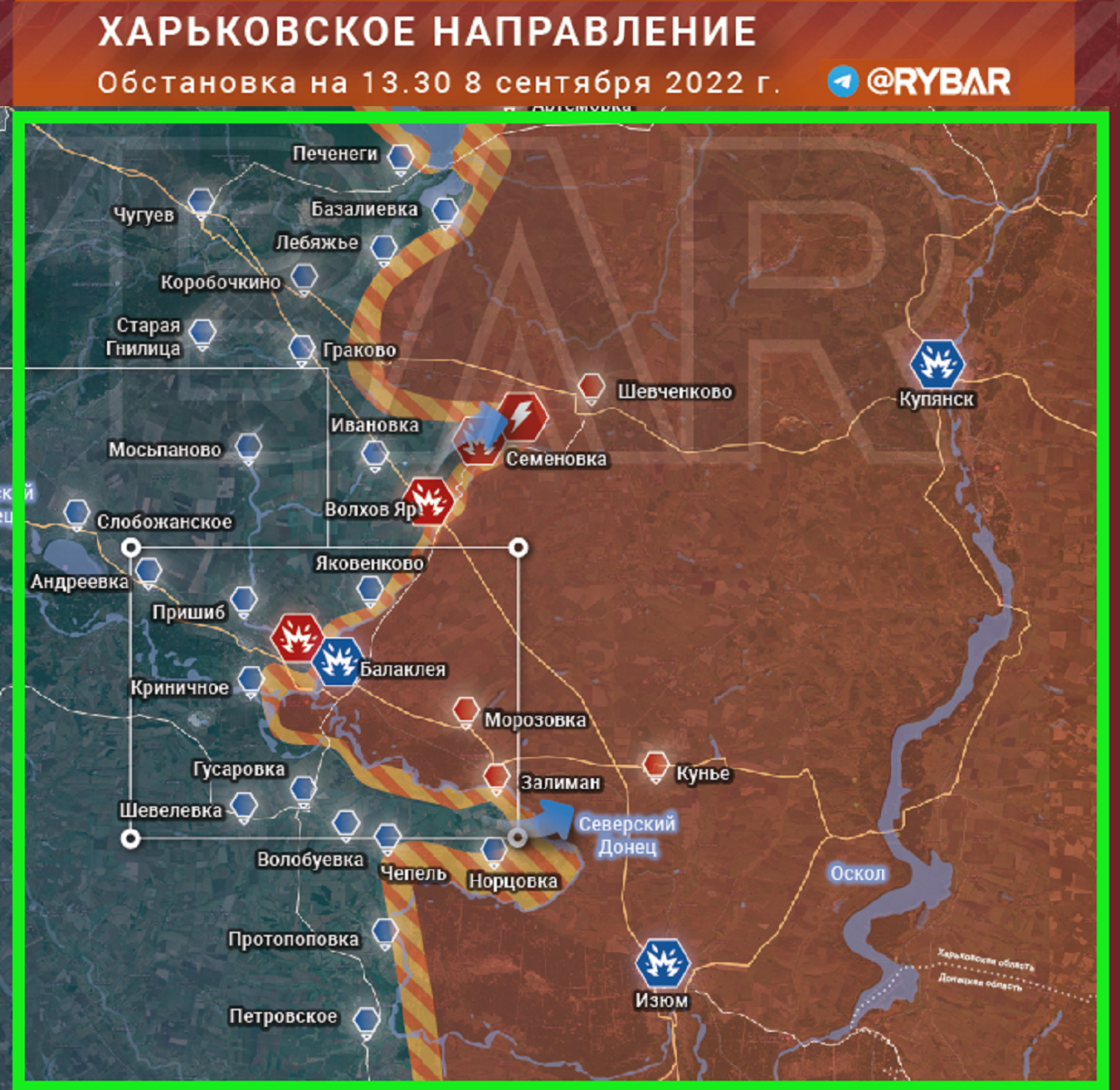 Pour mieux comprendre la situation entre Izioum et Koupiansk voici, en liens, deux cartes Rybar, dont l’une encadrée en vert est un extrait de la situation hier sensiblement à l’heure du point fait par Xavier Moreau.