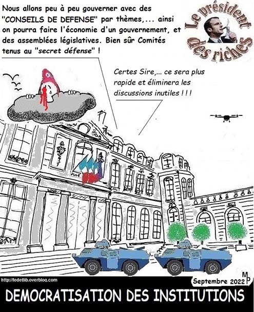 Le "Conseil de défense", normalement c’est pour la guerre. Il a le secret défense. Un tel conseil a déjà été abusivement mis en place par Macron pour la pseudo-crise du covid. Maintenant, Macron en met à nouveau un en place pour "parer" à la crise énergétique qui n’est dû qu’à sa politique de guerre absurde contre la Russie.