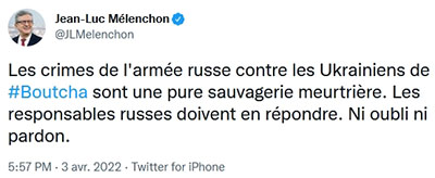 Mélenchon choisit la facilité médiatique ; et, sans même une enquête, accuse les Russes pour le crime de Boutcha. Mélenchon se couche devant le pouvoir. Il ne peut donc rien pour vous.