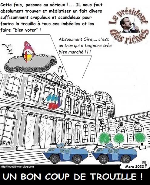 AQ, 31 mars 2022 : La guerre continue et couvre la prochaine élection du président de la République. Macron a tout utilisé pour éviter un débat public sur son bilan, bien plus encore sur sa politique internationale. Il voudrait se faire élire par défaut, sans faire autre campagne que celle qui font les moyens de communication de masses complètmeent à son service.