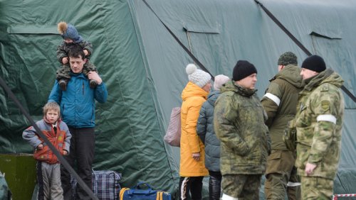 Des réfugiés de Marioupol arrivent dans un centre d’accueil administré par la République populaire de Donetsk dans le village de Bezymennoye le 10 mars 2022.