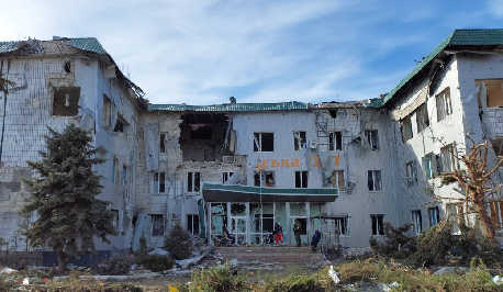 Nous poursuivons jusqu’à l’hôpital, car on nous a indiqué que les soldats ukrainiens y avaient installé des postes de tirs (ce qui est une violation de la convention de Genève). Information confirmée par le directeur et le médecin-chef de l’hôpital. Malgré les tirs, et la destruction de l’hôpital, ces derniers ont assuré accouchements et soins d’urgence dans les sous-sols, dont une partie était occupée par les soldats ukrainiens et leurs munitions. Plusieurs corps de soldats ukrainiens sont d’ailleurs toujours là au sous-sol, au rez-de-chaussée et dehors, près du bâtiment principal de l’hôpital.
