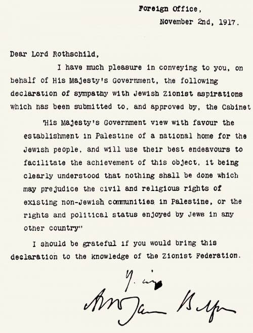« Le gouvernement de Sa Majesté envisage favorablement l’établissement en Palestine d’un foyer national pour les Juifs et fera tout ce qui est en son pouvoir pour faciliter la réalisation de cet objectif, étant clairement entendu que rien ne sera fait qui puisse porter atteinte soit aux droits civiques et religieux des collectivités non juives existant en Palestine, soit aux droits et au statut politique dont les Juifs disposent dans tout autre pays.
