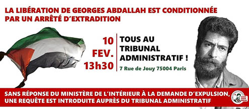 Soyons nombreux ce jour-là devant le tribunal administratif de Paris, 7 rue de Jouy, dans le 4e arrondissement de Paris, à 14h et faisons entendre le plus largement possible ce cri pour la liberté de Georges Abdallah.
