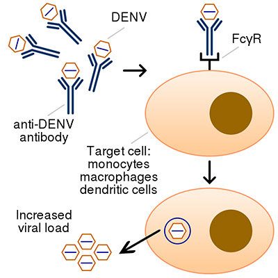 Wikipédia :Il y a facilitation de l’infection par des anticorps quand des anticorps (ici représentés par des structures bleues en forme de Y) se lient à aux particules virales (étiquetées DENV) et aux récepteurs gamma Fc (étiquetés FcγR) exprimés sur les cellules immunitaires (ici représentées par les ovales orangés), augmentant la probabilité que les virus infectent ces cellules (justement chargées de défendre l’organisme contre les infections)
