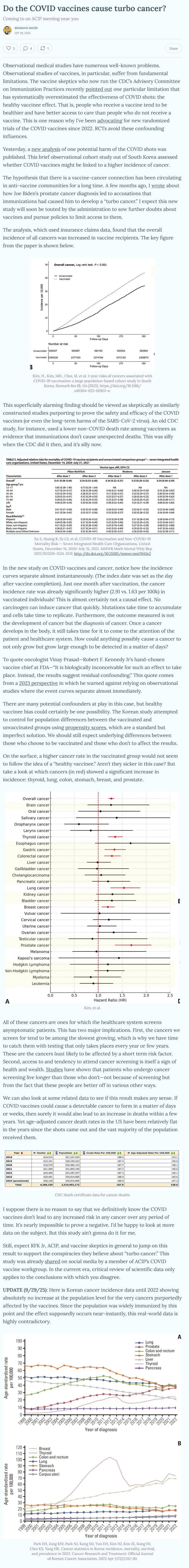 Et de produire, sur son post, les données sur l’incidence du cancer en Corée jusqu’en 2022, qui ne montrent aucune augmentation au niveau de la population pour les cancers prétendument affectés par les vaccins. « Etant donné que la population était alors largement immunisée, souligne-t-il, et que l’effet est censé se produire quasi instantanément, ces données réelles sont très contradictoires. »