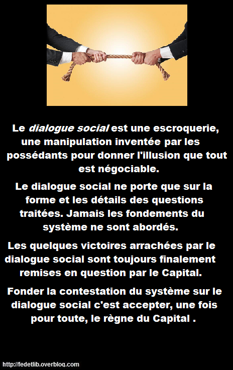 Le capitalisme (ou/et le banco-centralisme) est une tunique de Nessus. Elle se resserre dès qu’on cesse de se battre et se desserre suffisamment pour ne pas se déchirer quand on se bat. Puis, se resserre à nouveau. Ce qu’il faut, c’est enlever la tunique de Nessus. La négociation sert à desserrer pour quelque temps la tunique. Pour qu’elle ne puisse plus se resserrer, il faut l’enlever. Cela s’appelle la révolution.