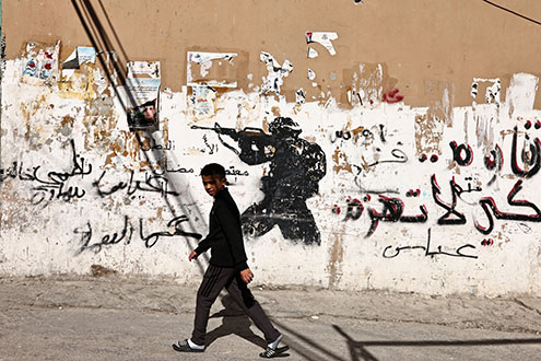 Ramallah, le 11 mars 2025. Un garçon passe devant un graffiti représentant un combattant palestinien dans le camp d’Al-Amari, au sud de Ramallah, en Cisjordanie occupée.Zain JAAFAR / AFP