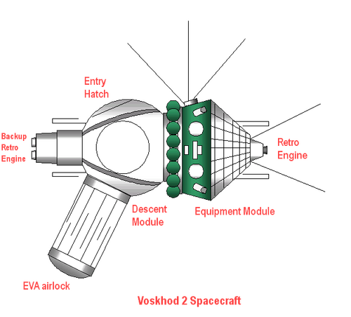 La version modifiée du vaisseau Vostok est baptisée Voskhod. Pour pouvoir emporter trois passagers dans l’espace limité du vaisseau qui a été conçu pour une seule personne des impasses importantes sont faites sur la sécurité : il n’y a plus de tour de sauvetage et les cosmonautes ne portent pas de scaphandres.
