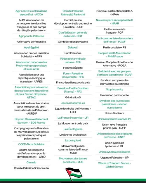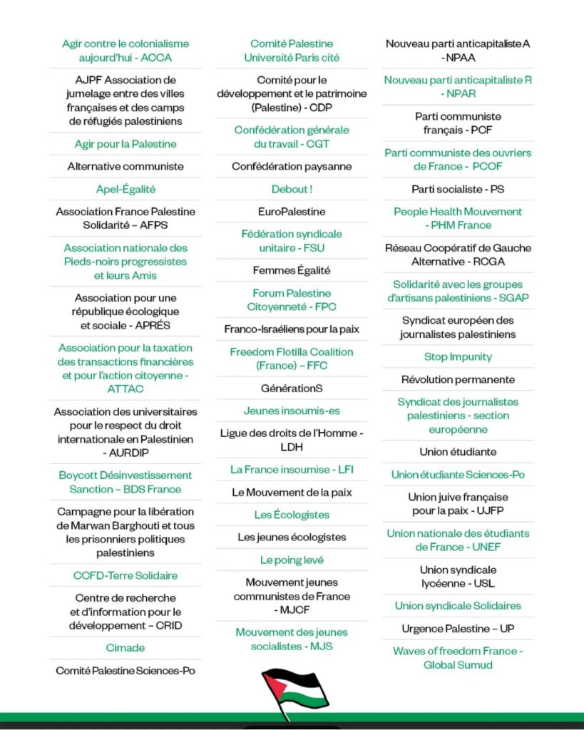 Une date a retenir dès maintenant : plusieurs dizaines d’associations, partis et syndicats, de la CGT à LFI, en passant par l’AFPS et EuroPalestine, viennent de s’engager pour l’organisation, à Paris, le samedi 29 novembre 2025, d’une manifestation nationale à Paris pour exiger :