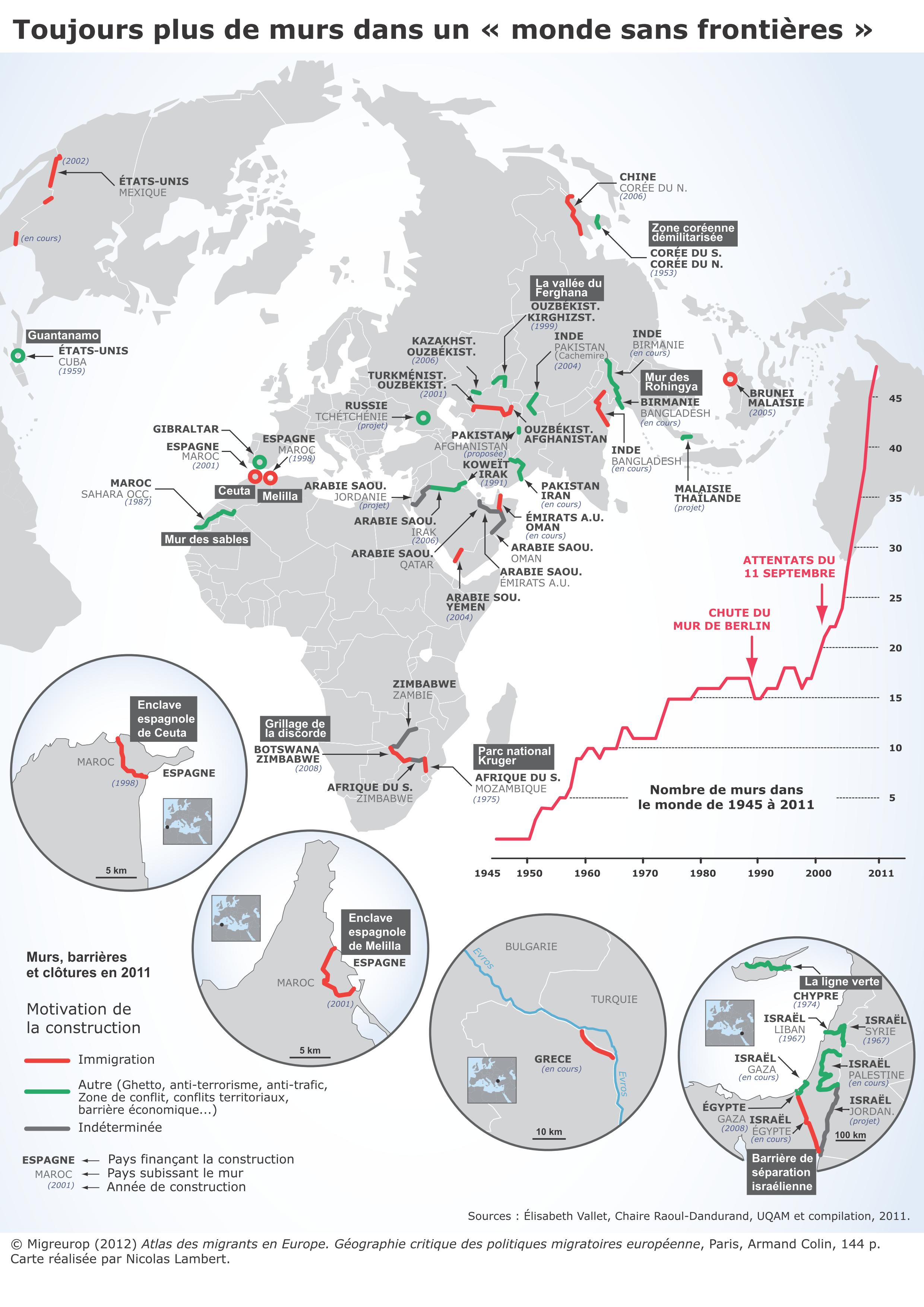 Des milliers de kilomètres de frontières réputées infranchissables séparent aujourd’hui les États-Unis et le Mexique, l’Union européenne et l’Afrique (notamment entre l’Espagne et le Maroc, mais aussi tout le long des côtes méditerranéennes par une forme de blindage maritime, une mer blindée), l’Inde et le Bangladesh, l’Irak et l’Arabie saoudite, etc.
