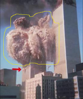 Je suis sidéré que tous ceux qui ont compris qu’il y avait des explosifs dans les tours soient obnubilés par ces minuscules fumeroles, comme celle indiquée ici par la belle flèche rouge faite par un utilisateur averti des logiciels de photos ; alors que l’énorme explosion juste au-dessus leur crève les yeux. Explosion que j’entoure d’un très maladroit trait jaune dans l’espoir qu’elle soit enfin vue ; car, manifestement, quand la vérité est trop aveuglante, elle rend aveugle !