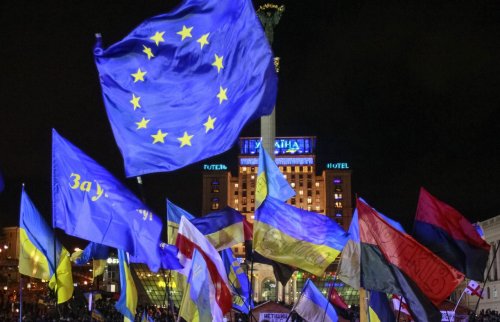 Le drapeau de l’Europe soutient le drapeau rouge et noir de Bandera, le fameux chef des collabos ukrainiens des nazis pendant la deuxième guerre mondiale