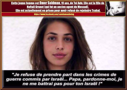 L’objectrice de conscience, Omer Goldman, âgée de dix-neuf ans et originaire de Ramat HaSharon, dans la banlieue de Tel Aviv, a été condamnée à vingt-et-un jours de prison le 22 septembre. Elle pourrait être condamnée à d’autres peines d’emprisonnement après qu’elle aura purgé cette première peine. Dans sa déclaration de refus, elle précise : Je refuse de servir dans l’armée israélienne. Je ne ferai pas partie d’une armée qui, sans nécessité, applique une politique violente et viole quotidiennement les droits les plus fondamentaux. Comme la plupart de mes camarades, moi non plus je n’ai pas osé remettre en question l’éthique de l’armée israélienne. Mais quand j’ai visité les Territoires occupés, j’ai compris que j’avais devant moi une réalité complètement différente, une réalité violente, oppressante et extrême à laquelle il faut mettre un terme. Je crois qu’il faut servir la société à laquelle j’appartiens et c’est précisément la raison pour laquelle je refuse de prendre part aux crimes de guerre commis par mon pays. La violence n’apportera aucune solution et je ne commettrai pas de violence, quoi qu’il arrive.