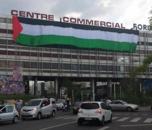 Gaza, Gaza, Aulnay-sous-Bois (Seine-Saint-Denis, 93) est avec toi ! Un drapeau palestinien géant déployé sur le centre commercial Galion de la ville.