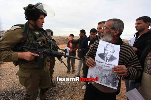 Le portrait de Nelson Mandela brandi face à l’armée d’occupation israélienne par les résistant-e-s du village de Bil’in en Palestine occupée, en lutte contre l’apartheid israélien. Prises ce vendredi 06 décembre 2013 (Photos : Issam Rimawi, Mohammed Yasin et Hamza Burnat photography)