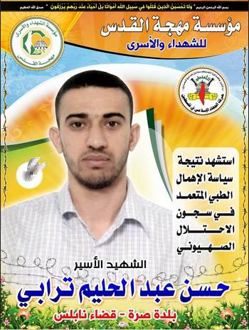 Une affiche en hommage au résistant Palestinien Hassan A’bdel Halim Turabi décédé le 05 novembre, suite à des manques de soins, dans les prisons israéliennes.
