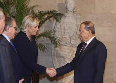 Note de do : Il est d’autant plus honteux pour Michel Aoun, président de la république libanaise, d’avoir accepté de recevoir la fasciste Marine la Haine que celle-ci a fait allégeance au sionisme depuis au moins cinq ans : alors que, lui, Michel Aoun, s’était allié au Hezbollah pour combattre l’invasion israélienne du Liban en 2006. Peut-on parler d’une trahison ?