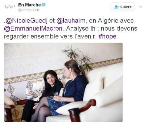 DIA-13 février 2017 : Dans la délégation d’Emmanuel Macron qui a été accueillie comme un président à Alger, il y avait Nicole Guedj la présidente de la Fondation France-Israël et cofondatrice de l’UPJF, une association pro-Israël marquée à droite et qui s’est illustrée par un discours raciste et anti-musulman.