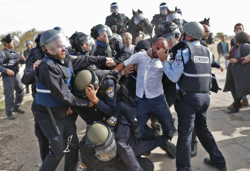 Des policiers israéliens répriment un rassemblement contre la démolition des maisons des bédouins Palestiniens du village d’Umm Al-Hirann le mercredi 18 janvier 2017