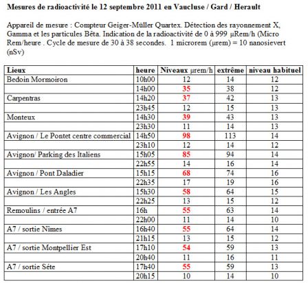 Un taux de radioactivité 7 fois supérieur à la mesure quotidienne sur Avignon et 3 fois supérieur au pied du Ventoux. D’après un article publié le 13 septembre 2011 sur le site internet de la coordination Antinucléaire Sud-Est, une « augmentation anormale » de la radioactivité portant sur la détection de rayonnements X, Gamma et particules Bêta aurait été mesurée dans un périmètre de 120 km en aval de Marcoule.