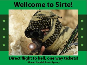 Brega et Ras Lanouf sont depuis hier, entre les mains des loyalistes. Hélas, les médias « meanstream » refusent d’en parler. Le peuple de Syrte et Bani Walid ne veut pas des rebelles. Et que fait l’OTAN ? Elle bombarde ces populations-là, avec l’aval de l’ONU, qui ose reconnaître une rébellion. C’est maintenant que la guerre commence. La population de Tripoli vit sous la terreur des terroristes du CNT. Drôle de démocratie où personne ne doit s’exprimer en défaveur du CNT :
