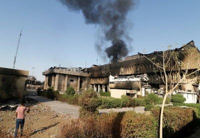 De la fumée s’élève le 7 septembre 2018 du siège du gouvernorat provincial à Bassora incendié ces derniers jours lors de manifestations.