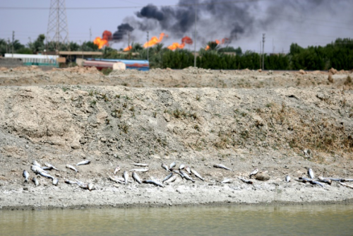 Des poissons pourrissent au soleil sur les bords des bassins de pisciculture à Bassora, dans le sud de l’Irak, le 29 août 2018.