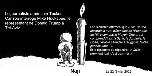 L’Humanité du 22 février 26 : De vives protestations s’élèvent dimanche 22 février 2026 dans le monde arabe et musulman après des propos de l’ambassadeur des États-Unis en Israël, Mike Huckabee, qui a affirmé que selon la tradition biblique, Israël aurait un droit sur des terres s’étendant sur une large partie du Moyen-Orient.