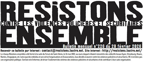 Voici en PDF, le n° 226, du 20 février 2026, du petit journal mobile recto-verso A4 "RESISTONS ENSEMBLE" du réseau contre les violences policières et sécuritaires.