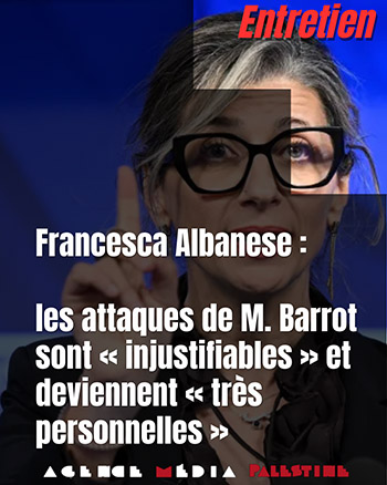 Francesca Albanese est à nouveau la cible d’une campagne calomnieuse en France, relayée au plus haut niveau de l’État dans le but d’obtenir son éviction des Nations Unies. Le ministre des Affaires étrangères Jean-Noël Barrot a annoncé le 11 février 2026 que la France allait demander la démission de la rapporteure spéciale de l’ONU sur les territoires palestiniens occupés après avoir exprimé son alignement sur une revendication de la très pro-israélienne députée Caroline Yadan. Celle-ci a notamment accusé Mme Albanese d’avoir déclaré qu’« Israël est l’ennemi commun de l’humanité » lors d’un forum le 7 février. Problème : Francesca Albanese n’a pas prononcé cette phrase, comme en atteste la vidéo de son intervention.