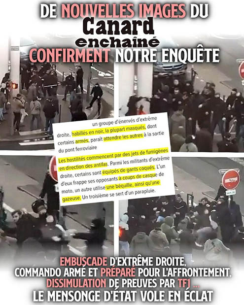 Vision complotiste : Le service d’ordre des "gauchistes" avait été infiltré par des agents spéciaux de l’État ou par des identitaires eux-mêmes afin de massacrer au moins un identitaire dans le but de faire de la pub à l’idéologie identitaire. N’oublions pas que Bardella est le candidat du système et que cette histoire lui fait de la pub. Si la version complotiste est fausse, ce qui ne m’étonnerait certainement pas, il est indispensable que les services d’ordre d’extrême gauche se fassent sermonner et apprennent à se maitriser afin d’éviter ce genre d’histoire totalement contre-productives.