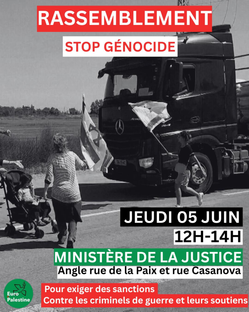 Nous serons jeudi rassemblés à l’angle de la rue de la Paix et de la rue Casanova pour interpeller les responsables du ministère de la justice sur l’absence d’ouverture d’instruction contre les Franco-israéliens qui commettent des crimes de guerre et des crimes contre l’humanité, alors que des plaintes ont été déposées depuis plus de 6 mois.