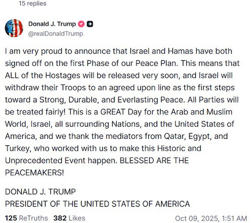 Trump qui aspire à recevoir le prix Nobel de la paix et est engagé dans une course contre la montre puisque la nomination doit être annoncée vendredi, s’est déclaré « fier qu’Israël et le Hamas aient signé la première phase du plan de paix ».
