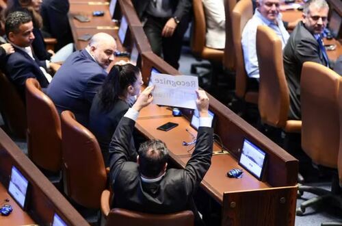 Le député Ayman Odeh brandit une affiche sur laquelle est écrit « Reconnaissance de la Palestine », à la Knesset, à Jérusalem, le 13 octobre 2025. EVELYN HOCKSTEIN/REUTERS