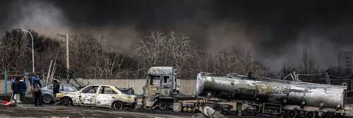 Un nuage de fumée noire recouvre les véhicules détruits près d’un incendie qui fait toujours rage après une frappe aérienne nocturne sur la raffinerie de pétrole de Shahran, au nord-ouest de Téhéran, le 8 mars 2026. (Photo © AFP via Getty Images)