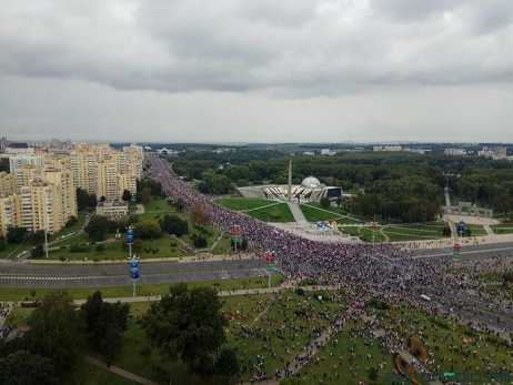 En quatre photos, émanant de quatre médias différents, mais sensiblement cadrées de la même façon, avec le carrefour de la Stèle de Minsk-Ville-Héroïque au premier plan, on voit ce qu’il en est réellement au fil des quatre dernières semaines, en commençant par la manif du 16 Août.