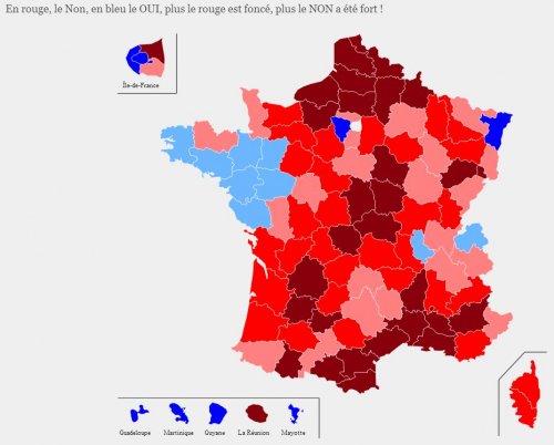 Les départements du OUI sont connus… de Paris avec 66% aux Haut-de Seine avec 61% jusqu’aux Yvelines avec 59%, c’est le cœur de la bourgeoisie Française autour de ses arrogantes tours de la défense qui a cru pouvoir imposer aux peuples cette camisole de force…