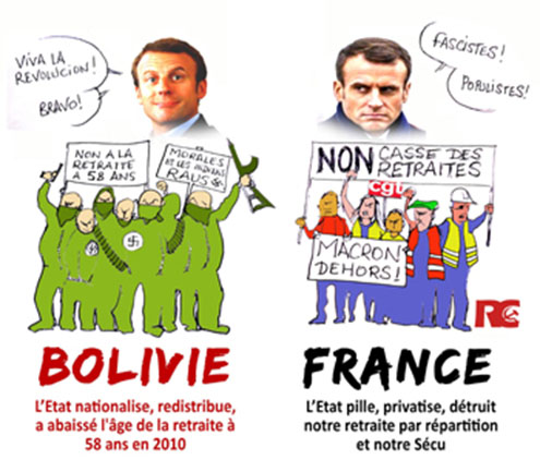 Evo Morales, le président réélu, vient d’être contraint par l’armée et la police à démissionner. Proclamé président du pays par le Tribunal supérieur électoral (TSE) conformément à la loi électorale du pays après un décompte établissant une avance de 10 points, les nervis fascistes ont, avant même la proclamation des résultats, lancé leurs opérations de déstabilisation selon un scénario que l’on a vu au Nicaragua, au Venezuela, voire au Brésil. L’attente des résultats définitifs liée au dépouillement plus long dans les régions rurales, reculées et pauvres, mais notoirement favorables à Morales, a été elle même le prétexte déjà raciste et fasciste pour contester les résultats depuis les beaux quartiers bourgeois des grandes villes.