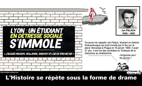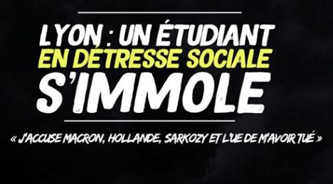 FRANCE 2019 - Un étudiant de 22 ans en détresse sociale, dégoûté par la violence de la société, s’est immolé ce vendredi 8 novembre 2019 à Lyon.