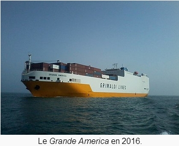 Le Grande America est un cargo porte-conteneurs-roulier, construit en 1997, coulé dans le golfe de Gascogne ( naufrage / incendie ), le 12 mars 2019, à environ 333 kilomètres à l’ouest des côtes françaises, par 4 600 mètres de fond.