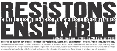 Voici en PDF, le no 180, du 26 février 2019, du petit journal mobile recto-verso A4 "RESISTONS ENSEMBLE" du réseau contre les violences policières et sécuritaires.